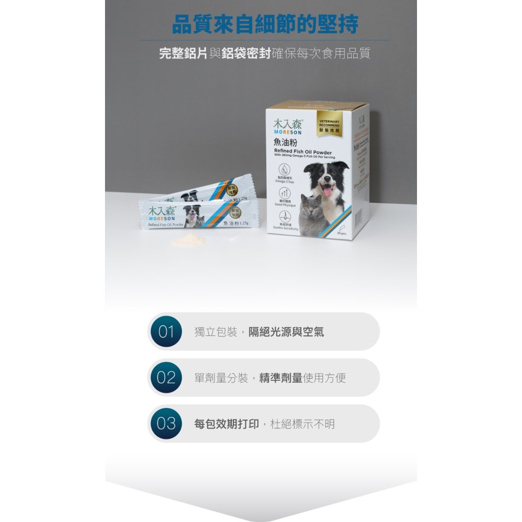 木入森魚油粉,有別於油狀的魚油可能有些毛孩不是很愛,是貓犬都愛吃的Omega-3營養來源。不只無腥味、適口性更高,餵食方便,專利「雙層包覆技術」還能完整新鮮保存魚油營養。