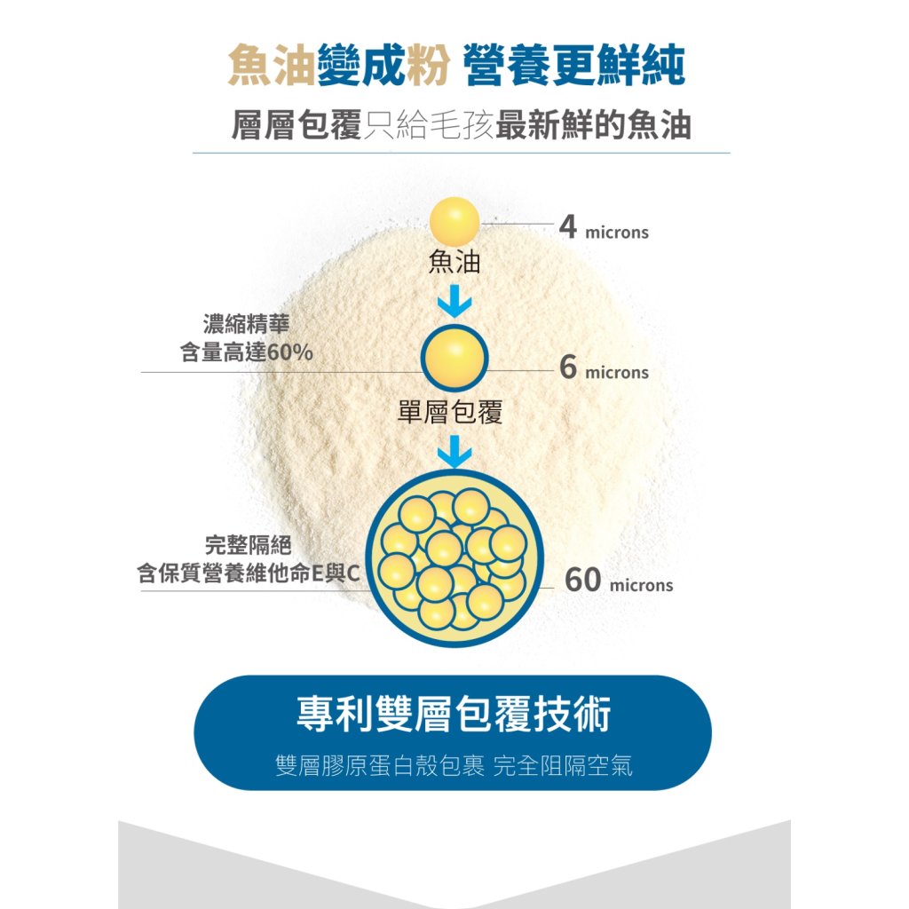 專利雙層包覆魚油粉﹝精製魚油、魚膠、維生素C、維生素E、葵花籽油、檸檬酸﹞